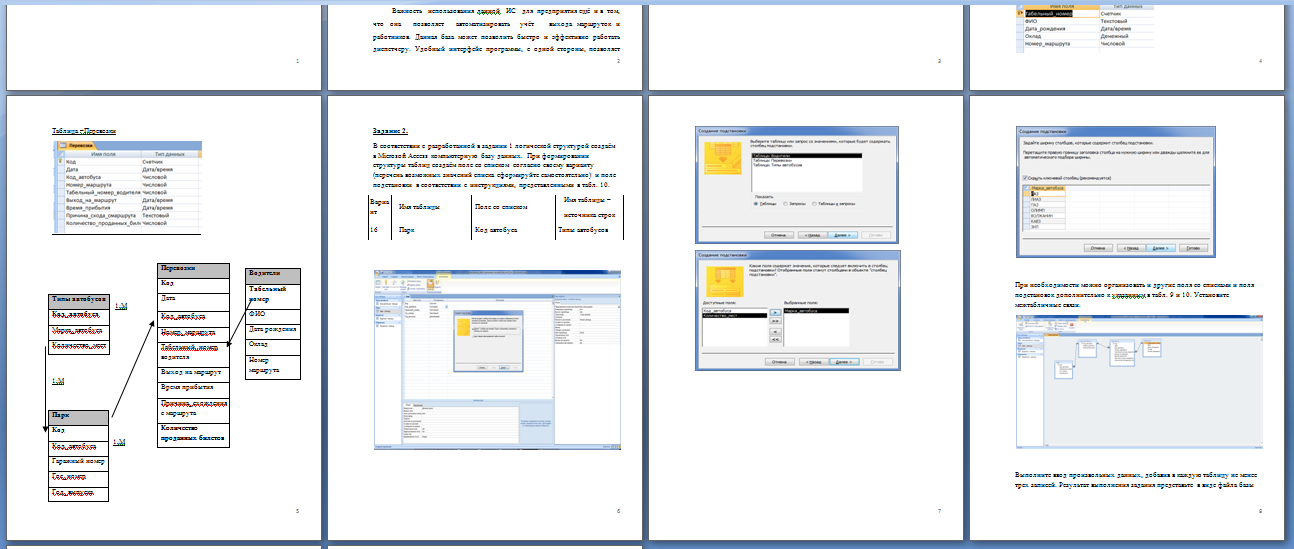 1. Проанализируйте предметную область решаемой задачи и разработайте логическую структуру соответствующей базы данных. Выделите в БД таблицы, выполняющие роль а) главной таблицы, б) подчиненной таблицы, в) справочника-классификатора. Задайте имена полей каждой таблицы, типы данных в них и свойства полей, соответствующие смысловому содержанию показателей, приведенных в табл. 8. Установите связи между таблицами. Результат выполнения задания представьте письменно в лабораторной тетради в виде.2. В соответствии с разработанной в задании 1 логической структурой создайте в Microsoft Access компьютерную базу данных. При формировании структуры таблиц создайте поле со списком (см. п. 1.3.4) согласно своему варианту (табл. 9) (перечень возможных значений списка сформируйте самостоятельно) и поле подстановки (см. п. 1.3.5) в соответствии с инструкциями, представленными в табл. 10. При необходимости можно организовать и другие поля со списками и поля подстановок дополнительно к указанным в табл. 9 и 10. Установите межтабличные связи. Выполните ввод произвольных данных, добавив в каждую таблицу не менее трех записей. Результат выполнения задания представьте в виде файла базы данных с указанием своих фамилии и номера варианта Фамилия_ВариантN.accdb.